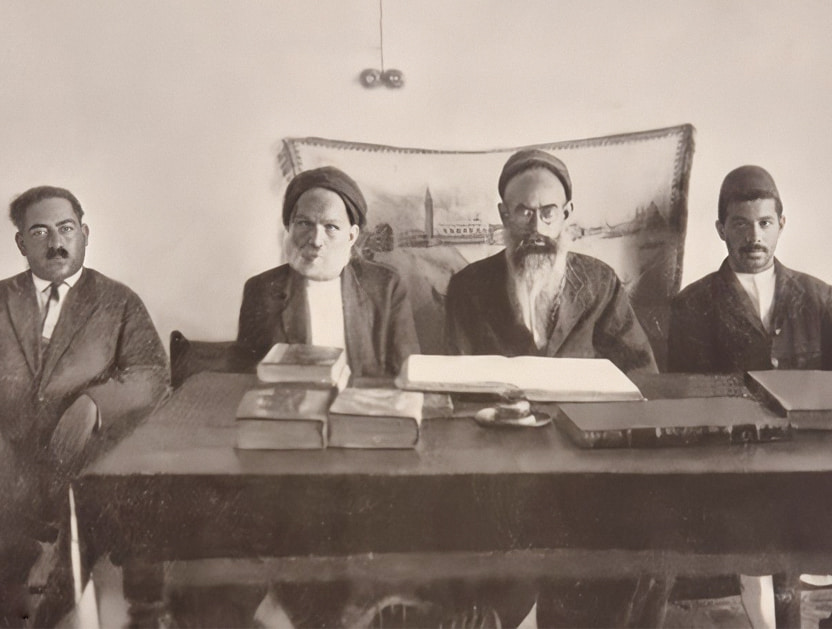 The rabbinical court in Benghazi. Mordechai Ha-Cohen is the second from the left.