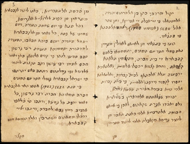 The target audience of the second manuscript was the local Jewish community. The background is incomplete, but in 1922, a judge in the Jewish rabbinical court in the city organized the Chevra Kadisha (community volunteers who prepare bodies for Jewish burial) under the name “Rabbeinu Gershom Society.” An annual feast was held in honor of Rabbeinu Gershom, marking the Chevra Kadisha’s contribution to the community. Ha-Cohen took it upon himself to educate the Jews of Benghazi about the historical significance of Rabbeinu Gershom. This work is written in Rashi script, but the language is Judeo-Arabic.