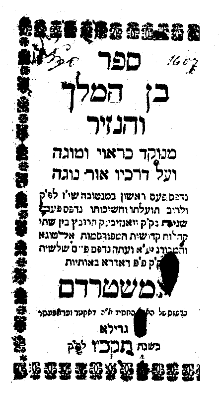 The title page of this edition of Ben ha-Melekh ve-ha-Nazir is misleading. The place of printing, Frankfurt on the Oder, appears in a small font while Amsterdam appears below in larger font. This is not an isolated instance of the misleading identification of the place of printing. In many cases from the late seventeenth through early nineteenth century, presses in other locations also attempted to associate their imprints with Amsterdam. Their location is minimized on the title pages and emphasis placed on Amsterdam, as that city was then the foremost center of Hebrew printing in Europe.22