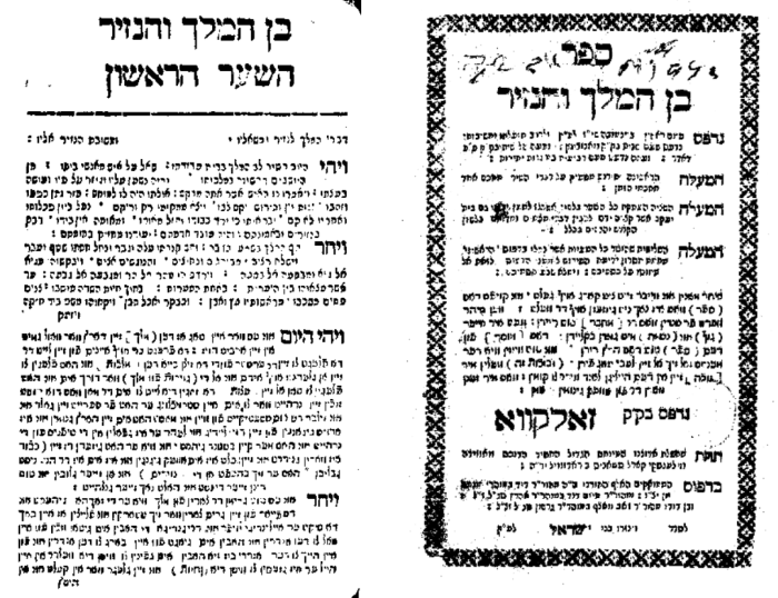 The Frankfurt on the Main issue of Ben ha-Melekh ve-ha-Nazir was printed in the year 1769, “wisdom preserves the life of him who possesses it והחכמה תחיה את בעלה (529 = 1769)” (cf. Ecclesiastes 7:12) at the press of Johann Beierhoffer in octavo format (80: 3,100, [1] [1] ff.). The title page mistakenly references the first printing as the Mantua edition and the second as the Wandsbeck edition. The text is accompanied by a translation from the Hebrew into Yiddish (Judeo-German), brought to press by R. Issac Homberg of Offenbach.